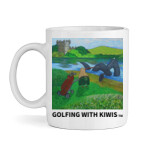 Start your morning with a laugh! Our "The Ultimate Birdie Block: Tea Time on the 18th!" mug features a scene where three elderly Kiwi ladies have taken over the 18th green with a full tea picnic, leaving frustrated golfers on the 17th in disbelief.
